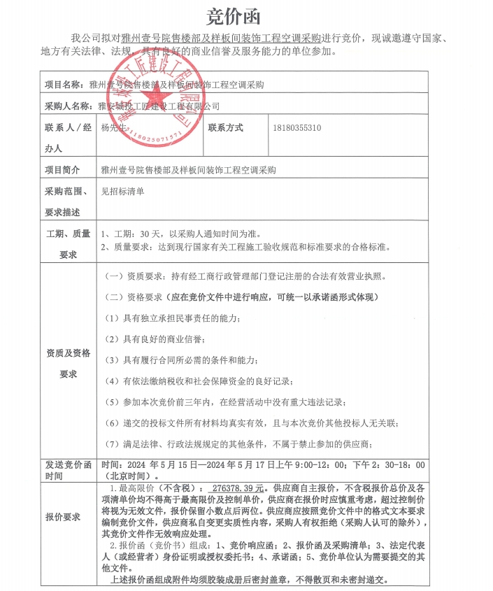雅州壹號院售樓部及樣板間裝飾工程空調(diào)采購競價公告