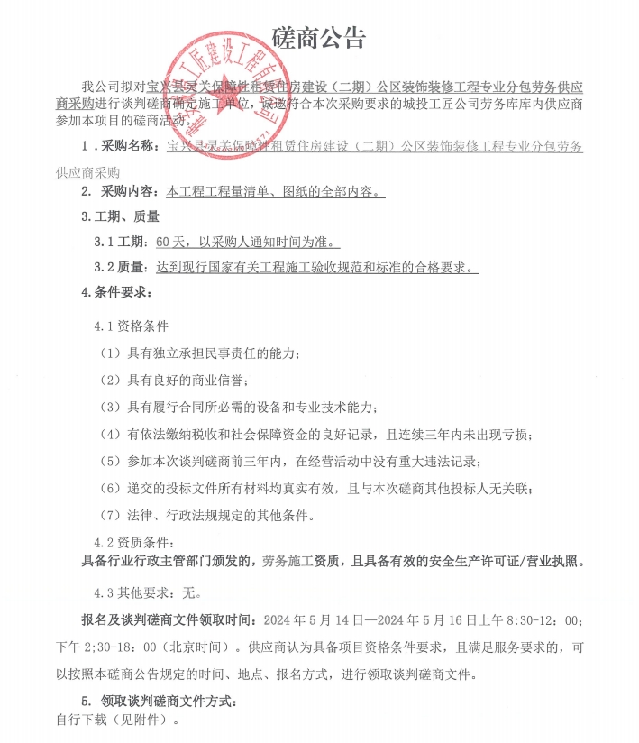寶興縣靈關(guān)保障性租賃住房建設(shè)(二期)公區(qū)裝飾裝修工程專業(yè)分包勞務(wù)供應(yīng)商采購談判磋商公告