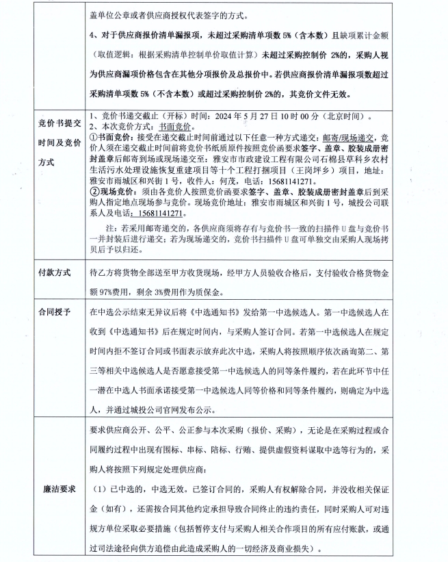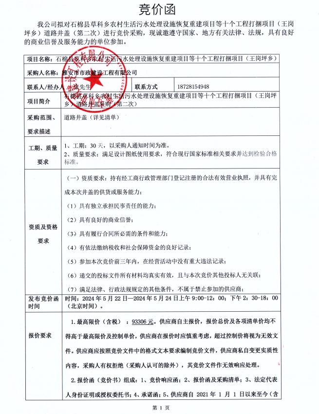 石棉縣草科鄉(xiāng)農(nóng)村生活污水處理設施恢復重建項目等十個工程打捆項目(王崗坪鄉(xiāng))道路井蓋競價采購(第二次)競價公告