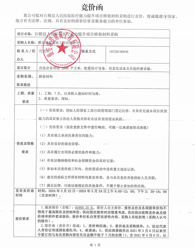 石棉縣人民醫(yī)院醫(yī)療能力提升橋架材料采購(gòu)競(jìng)價(jià)公告