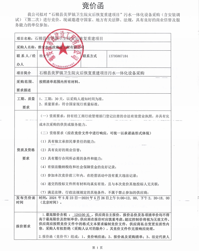 石棉縣美羅鎮(zhèn)衛(wèi)生院災后恢復重建項目污水一體化設備材料采購(第二次)競價公告