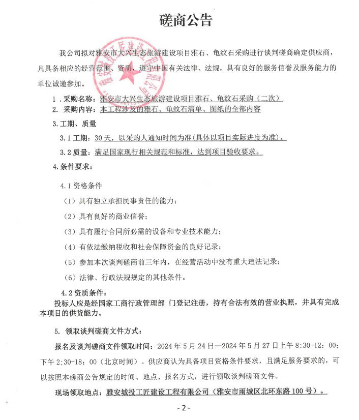 雅安市大興生態(tài)旅游建設(shè)項目雅石、龜紋石(二次)采購(第二次)磋商公告
