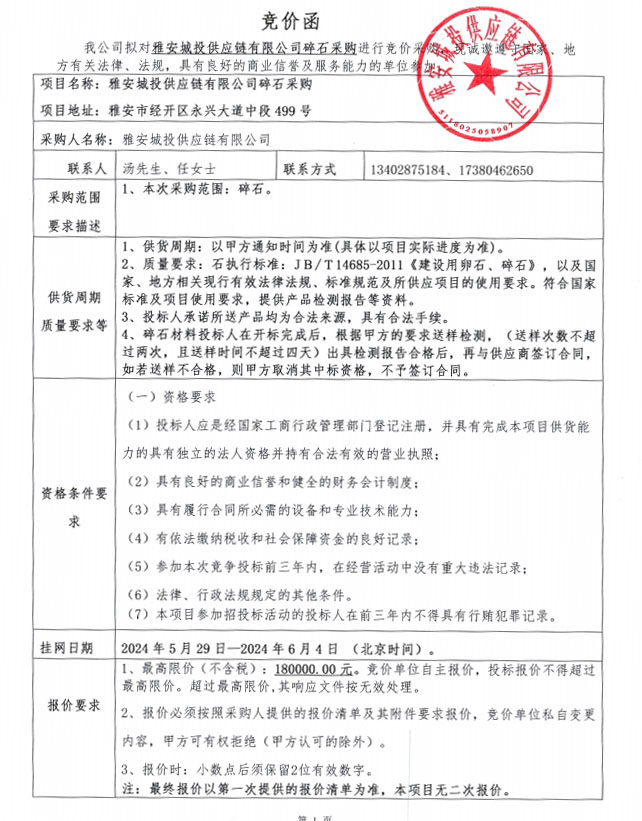 雅安城投供應(yīng)鏈有限公司碎石采購(gòu)競(jìng)價(jià)公告