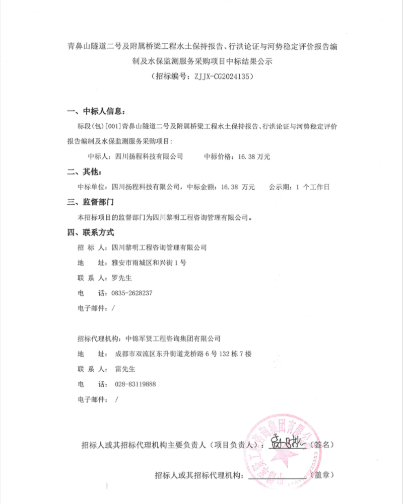 青鼻山隧道二號(hào)及附屬橋梁工程水土保持報(bào)告、行洪論證與河勢(shì)穩(wěn)定評(píng)價(jià)報(bào)告編制及水保監(jiān)測(cè)服務(wù)采購(gòu)項(xiàng)目中標(biāo)結(jié)果公示