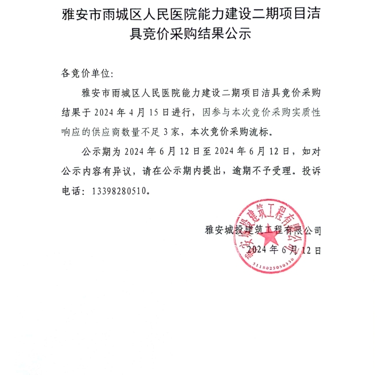 雅安市雨城人民醫(yī)院能力建設(shè)二期項(xiàng)目潔具競價(jià)采購結(jié)果公示