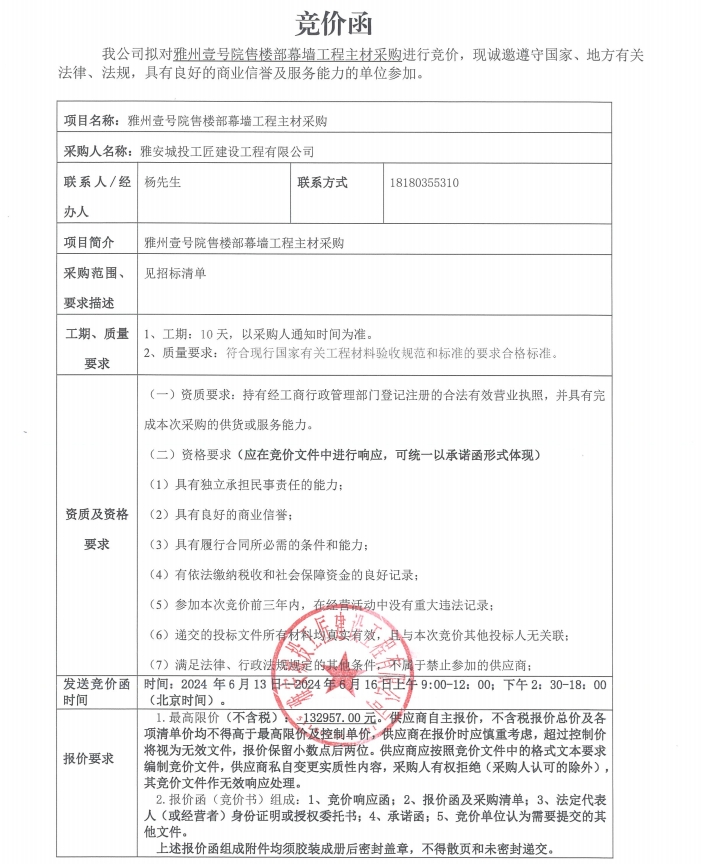 雅州壹號(hào)院售樓部幕墻工程主材采購(gòu)競(jìng)價(jià)公告