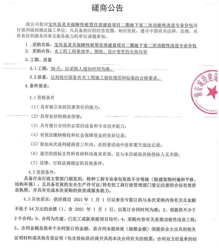 寶興縣靈關保障性租賃住房建設項目二期地下室二次功能性改造專業(yè)分包談判磋商公告