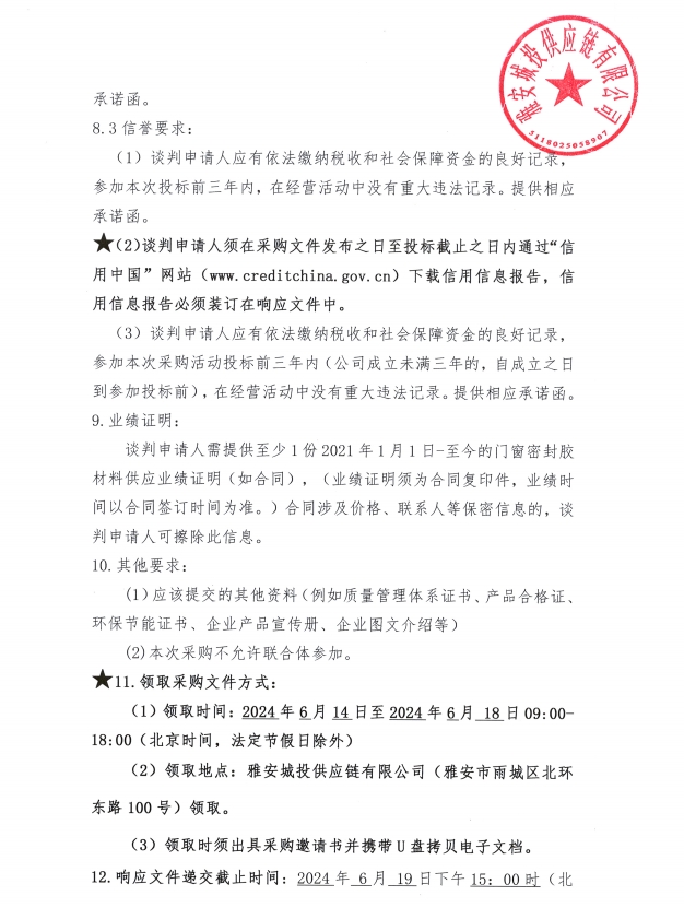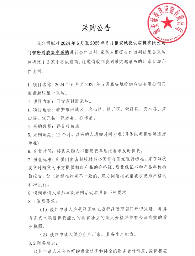 2024年6月至2025年5月雅安城投供應(yīng)鏈有限公司門窗密封膠集中采購(gòu)公告