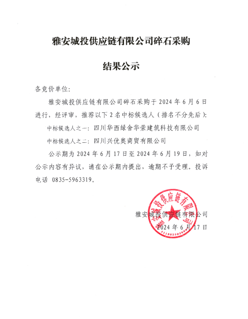 雅安城投供應鏈有限公司碎石采購結(jié)果公示