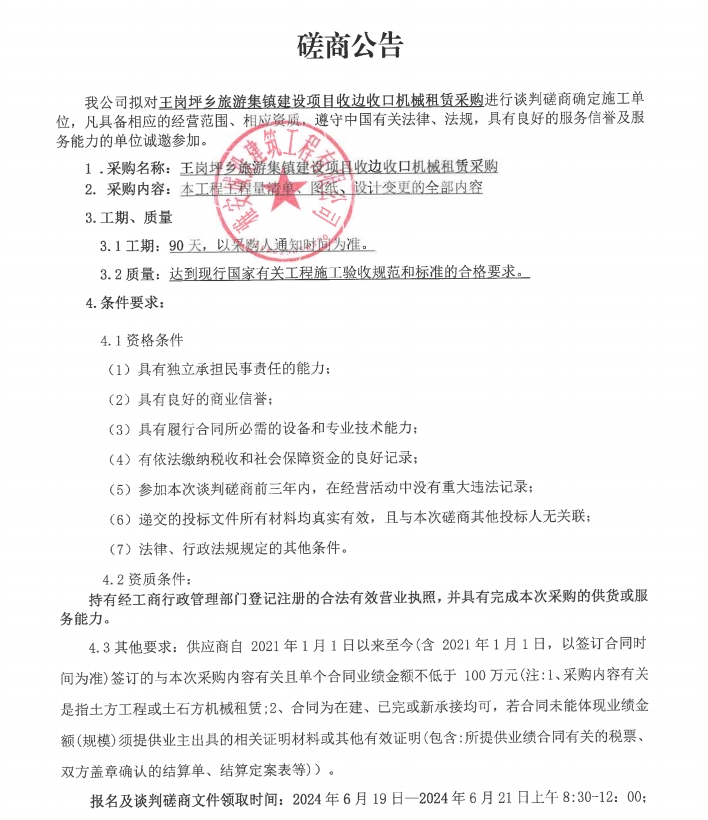 王崗坪鄉(xiāng)旅游集鎮(zhèn)建設項目收邊收口機械租賃采購談判磋商公告
