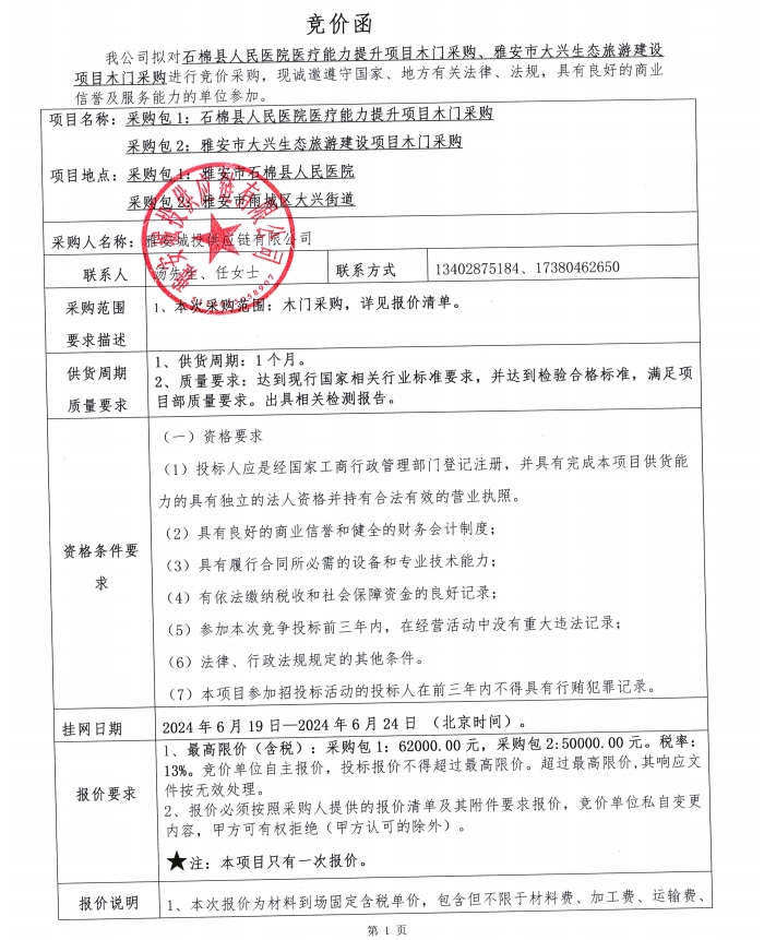 石棉縣人民醫(yī)院醫(yī)療能力提升項(xiàng)目木門(mén)采購(gòu)、雅安市大興生態(tài)旅游建設(shè)項(xiàng)目木門(mén)采購(gòu)競(jìng)價(jià)公告