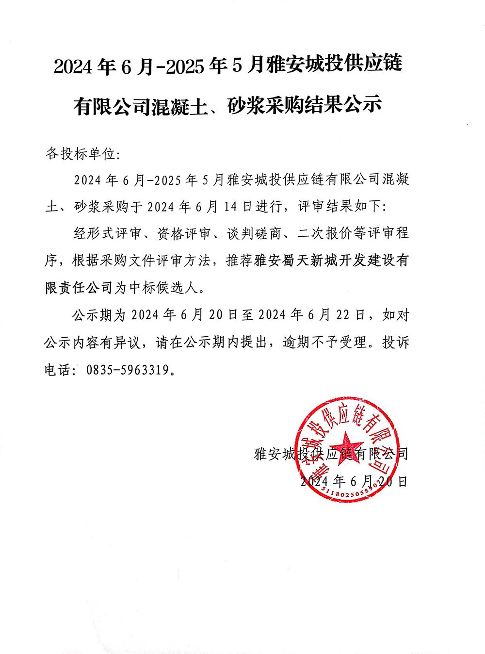 2024年6月-2025年5月雅安城投供應(yīng)鏈有限公司混凝土、砂漿采購結(jié)果公示