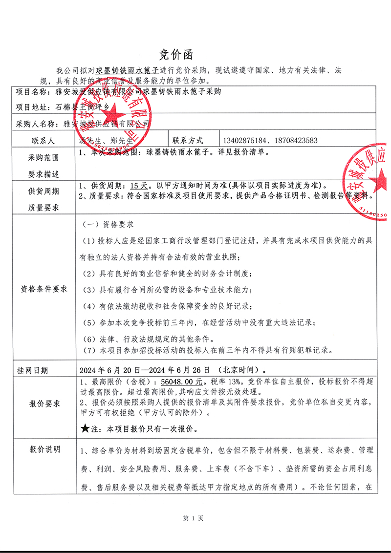 球墨鑄鐵雨水篦子競價采購函