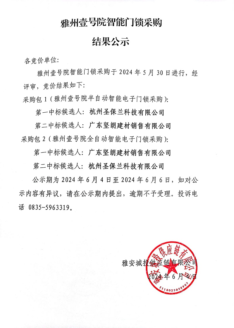 雅州壹號院智能門鎖采購結(jié)果公示