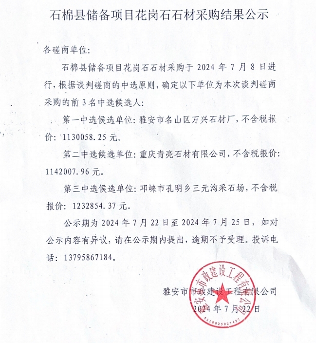 石棉縣儲備項目花崗石石材采購結果公示