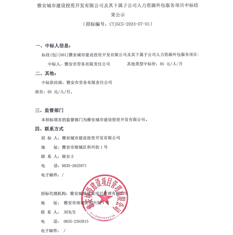 雅安城市建設(shè)投資開發(fā)有限公司及其下屬子公司人力資源外包服務(wù)項目中標(biāo)結(jié)果公示