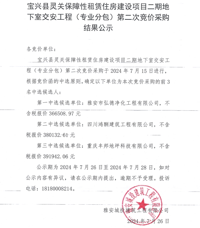 寶興縣靈關(guān)保障性租賃住房建設(shè)(二期)地下交安工程(專(zhuān)業(yè)分包)第二次競(jìng)價(jià)采購(gòu)結(jié)果公示