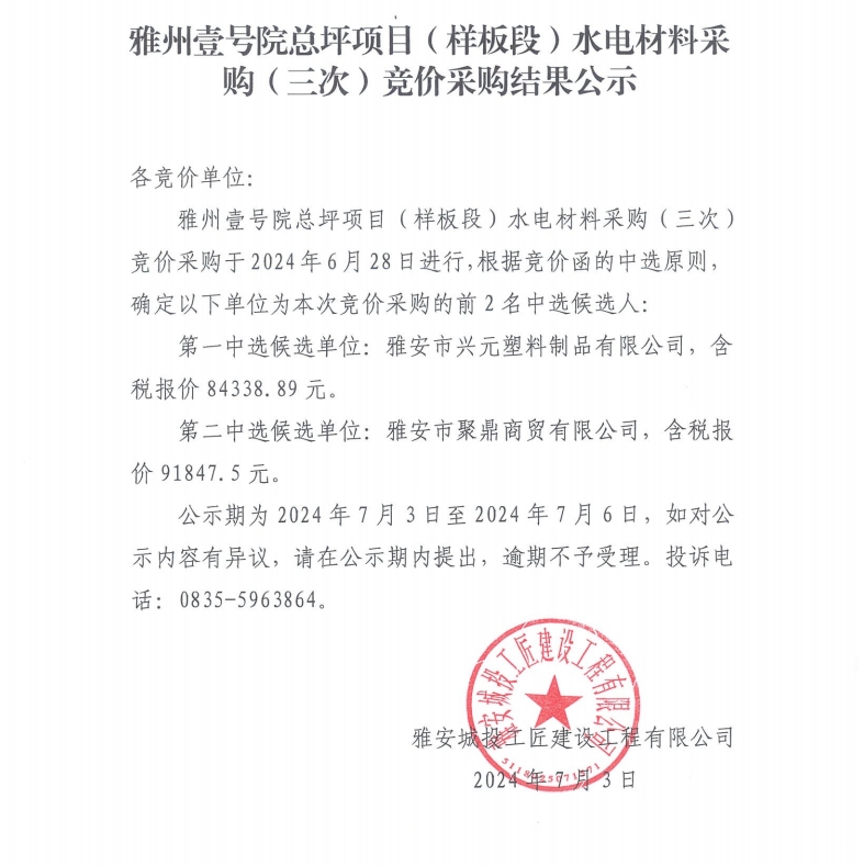 雅州壹號院總坪項目(樣板段)水電材料采購(三次)競價采購結果公示