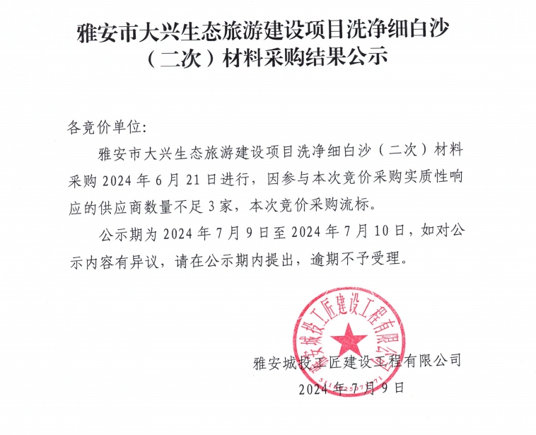 雅安市大興生態(tài)旅游建設(shè)項目洗凈細白沙(二次)材料采購結(jié)果公示