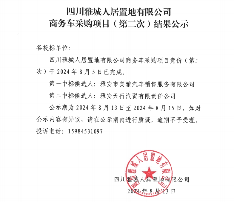 四川雅城人居置地有限公司商務車采購項目(第二次)結果公示