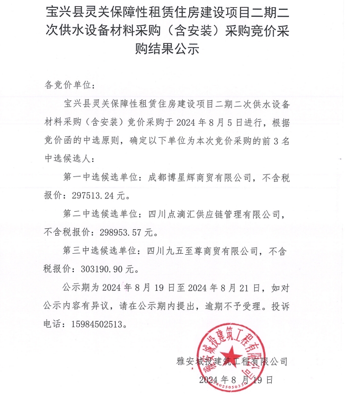 寶興縣靈關(guān)保障性租賃住房建設(shè)項(xiàng)目二期二次供水設(shè)備采購(gòu)(含安裝)采購(gòu)競(jìng)價(jià)采購(gòu)結(jié)果公示