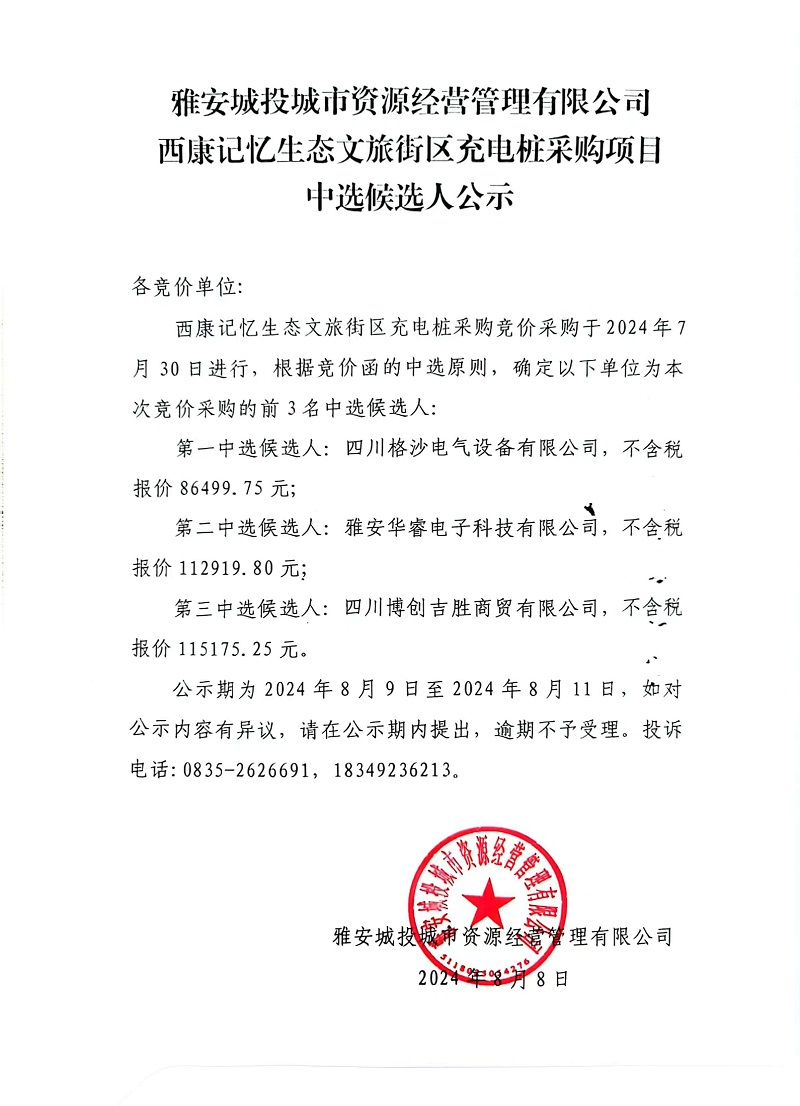 雅安城投城市資源經(jīng)營管理有限公司西康記憶生態(tài)文旅街區(qū)充電樁采購項(xiàng)目中選候選人公示