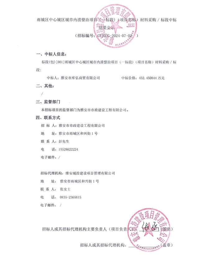 雨城區(qū)中心城區(qū)城市內澇整治項目(一標段)(項目名稱)材料采購/標段中標結果公示