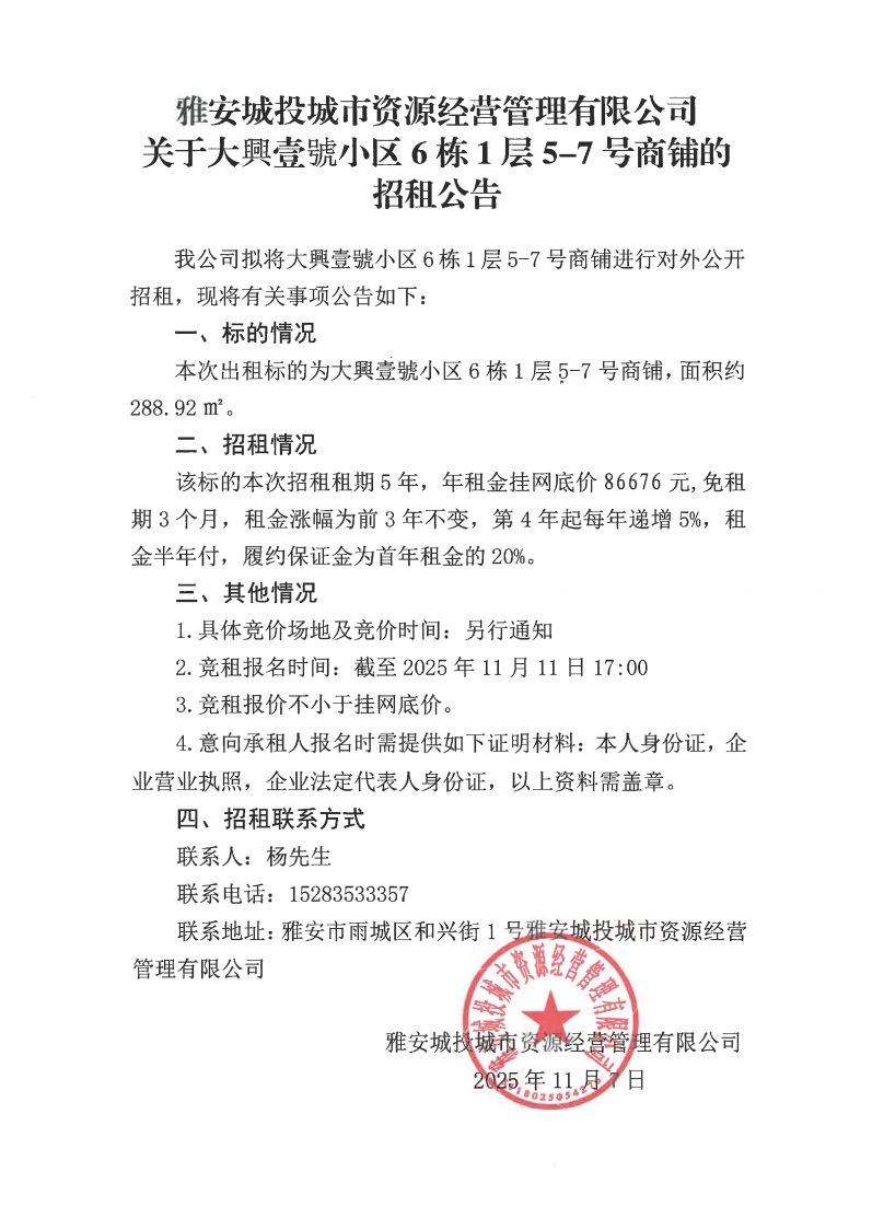 雅安城投城市資源經(jīng)營管理有限公司關(guān)于大興壹號小區(qū)6棟1層5-7號商鋪的招租公告