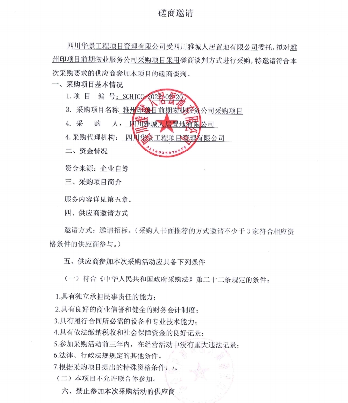 雅州印項(xiàng)目前期物業(yè)服務(wù)公司采購(gòu)項(xiàng)目磋商邀請(qǐng)
