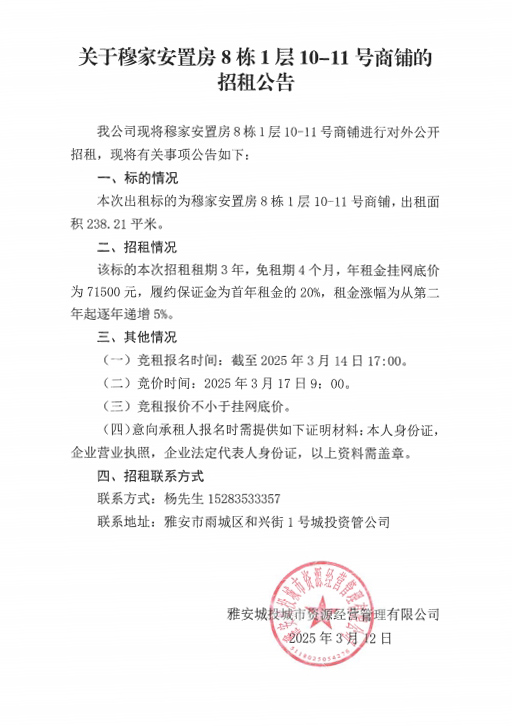 關(guān)于穆家安置房8棟1層10-11號商鋪的招租公告