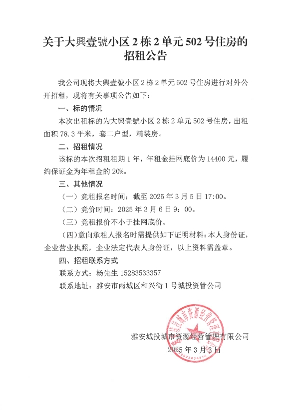 關(guān)于大興壹號小區(qū)2棟2單元502號住房的招租公告