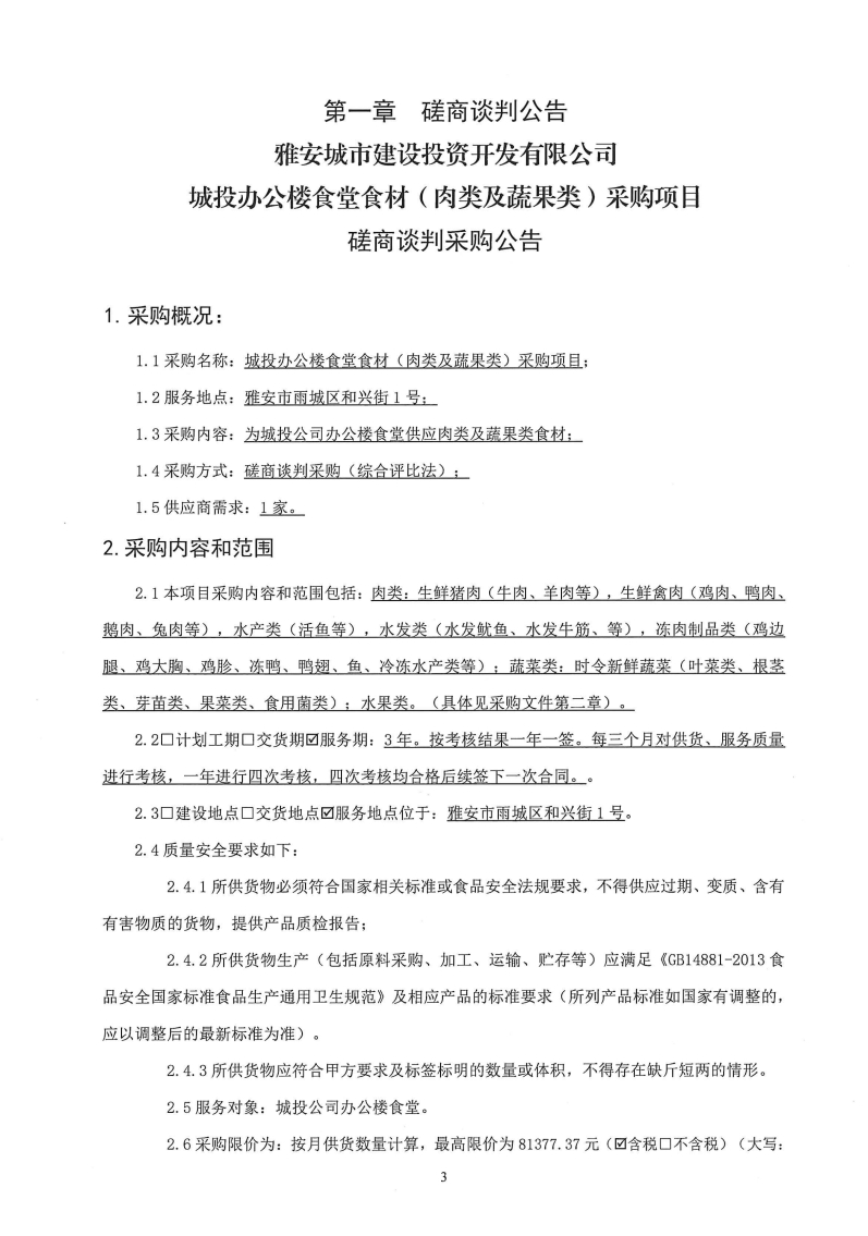 雅安城市建設(shè)投資開(kāi)發(fā)有限公司城投辦公樓食堂食材(肉類及蔬果類)采購(gòu)項(xiàng)目磋商談判采購(gòu)公告