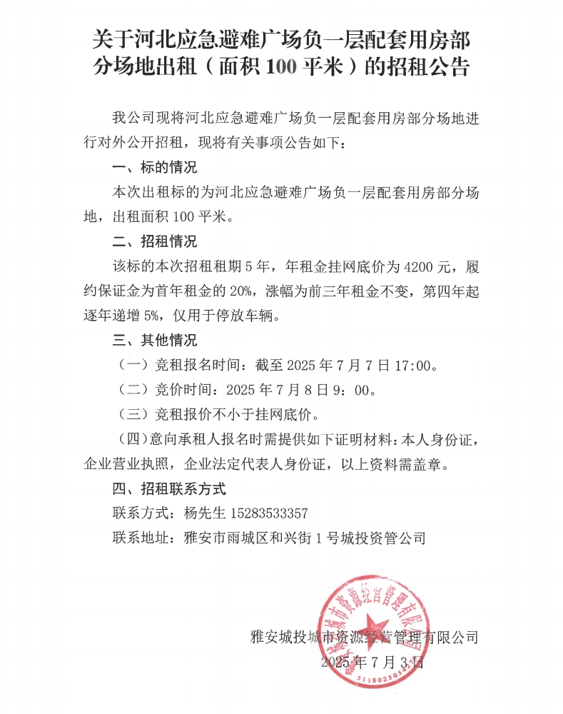 關(guān)于河北應(yīng)急避難廣場負(fù)一層配套用房部分場地出租(面積100平米)的招租公告