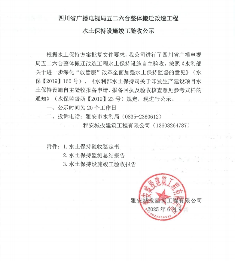 四川省廣播電視局五二六臺整體搬遷改造工程水土保持設(shè)施竣工驗收公示