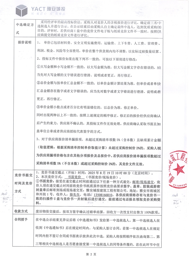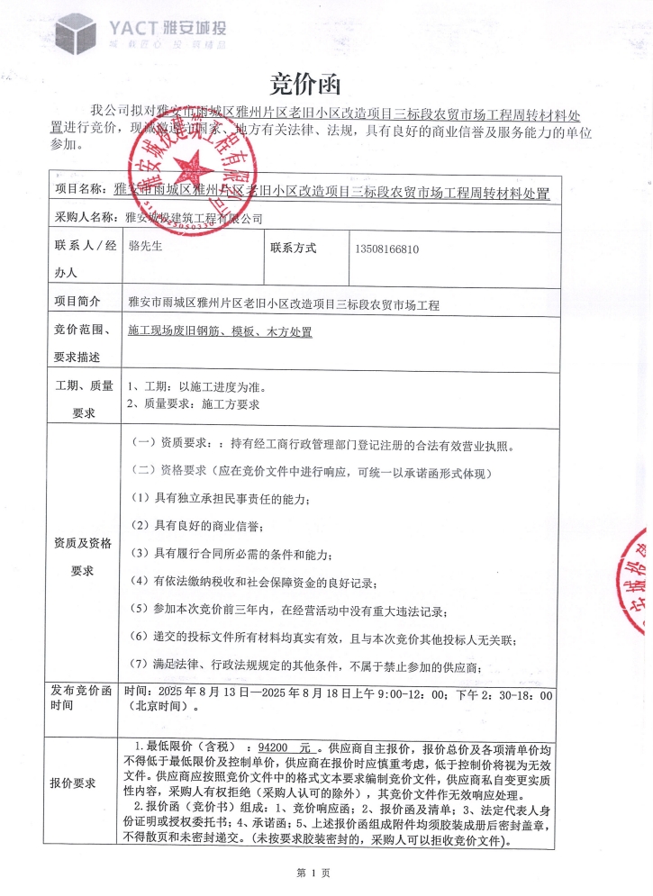 雅安市雨城區(qū)雅州片區(qū)老舊小區(qū)改造項目三標段農(nóng)貿(mào)市場工程周轉(zhuǎn)材料處置競價公告