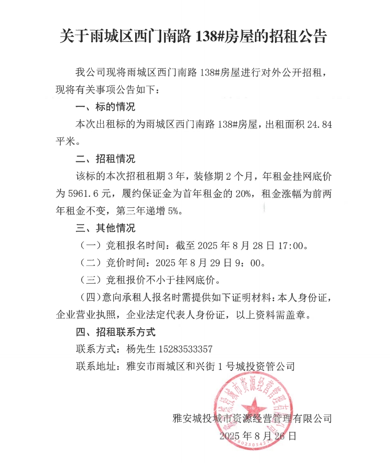 關(guān)于雨城區(qū)西門南路138#房屋的招租公告
