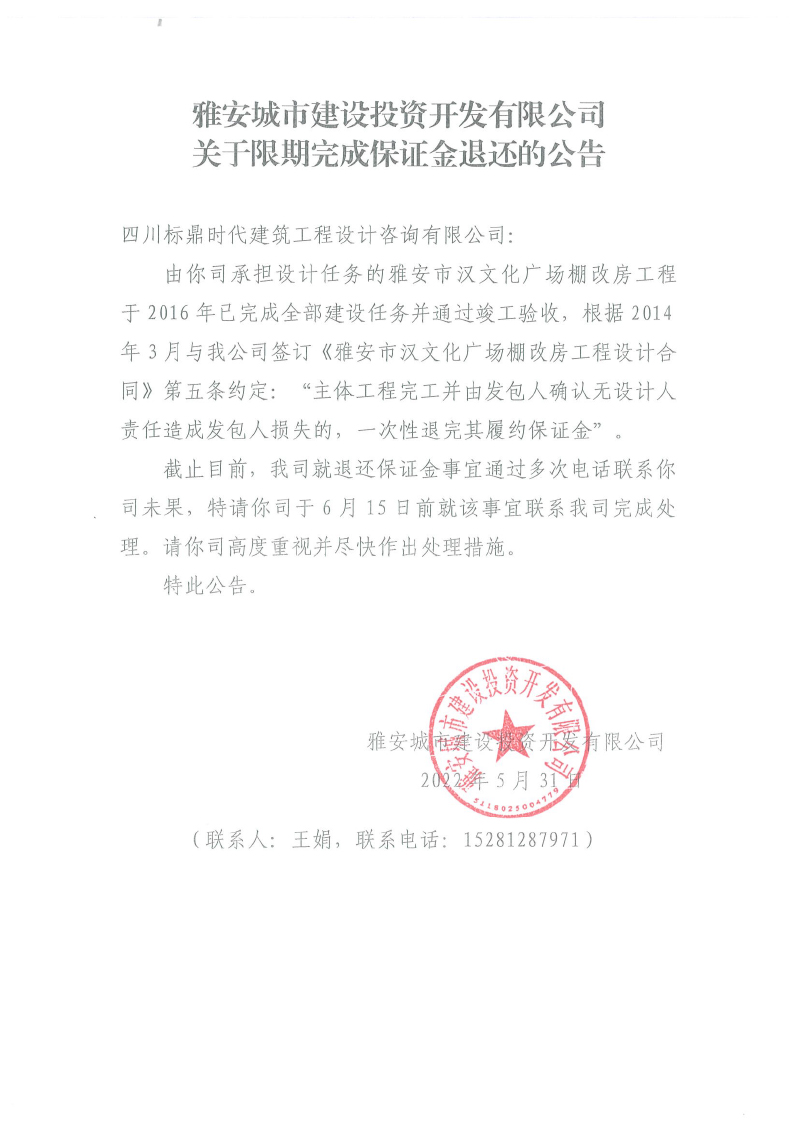 雅安城市建設投資開發(fā)有限公司關于限期完成保證金退還的公告