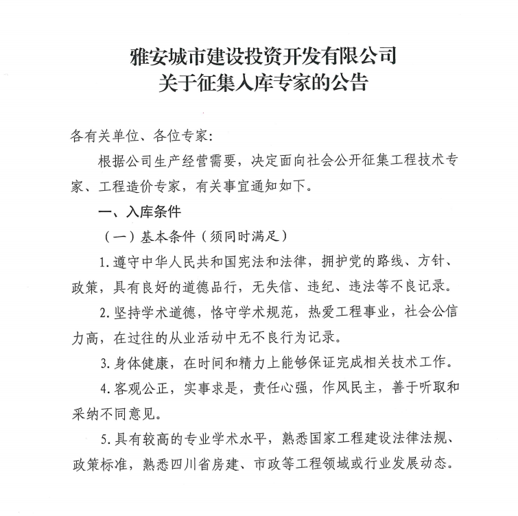 雅安城市建設投資開發(fā)有限公司關于征集入庫專家的公告